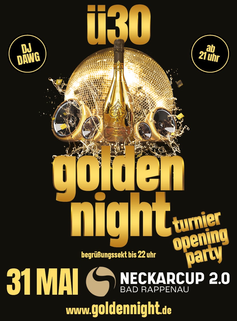 Ein Highlight im sportlichen Kalender der Region ist der Neckar-Cup - das ATP Tennisturnier mit Weltklassespielern. Erstmals findet das Turnier auf der großzügigen Anlage in Bad Rappenau statt. Im VIP-Zelt steigt zum Auftakt des Turniers am Samstag, den 31. Mai die golden night ü30 Party. An den Turntables steht Top DJ DAWG. Er kennt die Szene wie kein anderer und hat schon bei zahllosen großen Events und den angesagtesten Clubs aufgelegt. Los geht's um 21:00 Uhr. Feiern in einem außergewöhnlichen Ambiente beim internationelen Tennisturnier. Neben dem VIP-Zelt steht ein großer Außenbereich zur Verfügung. Der Neckar Cup in Bad Rappenau bietet den perfekten Rahmen für eine fantastische ü30 Party.